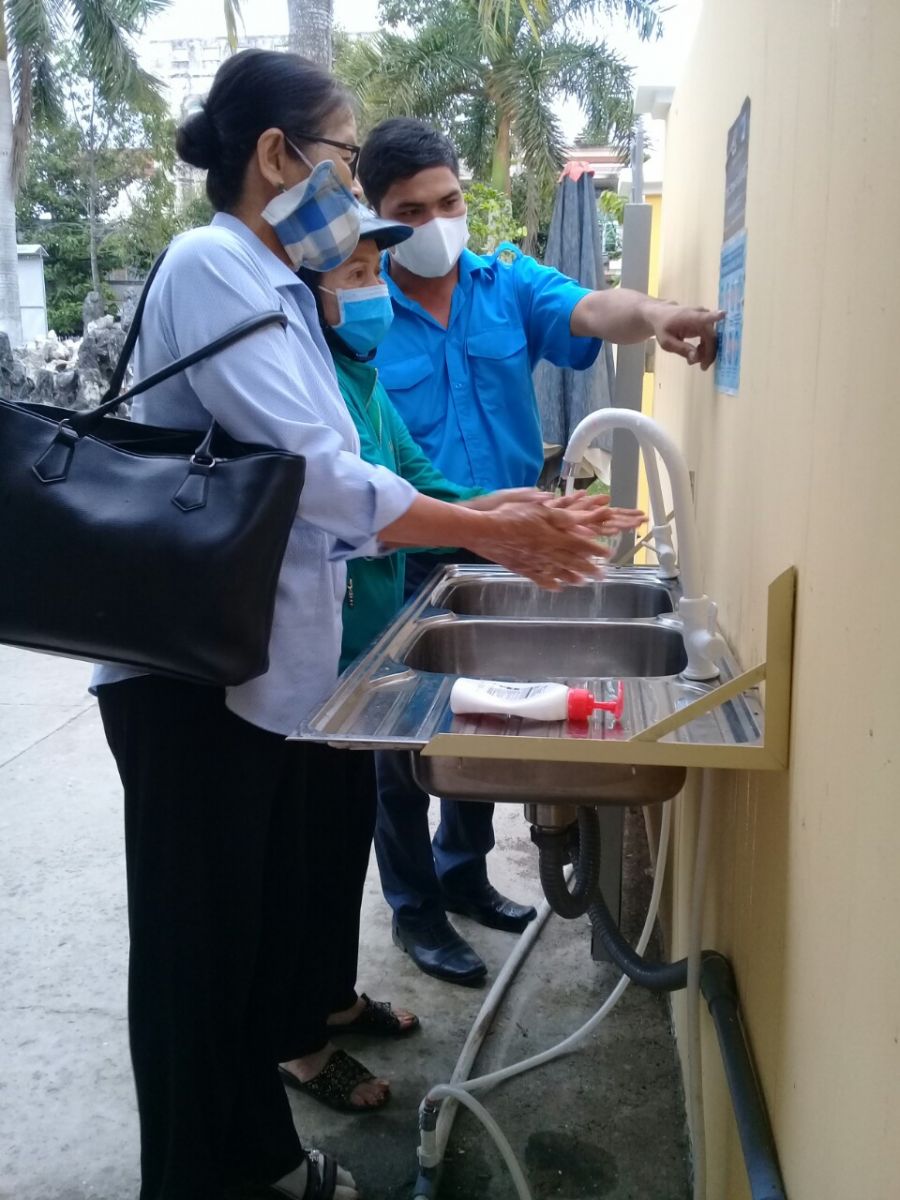 Anh Thùy hướng dẫn người dân rửa tay theo đúng quy định