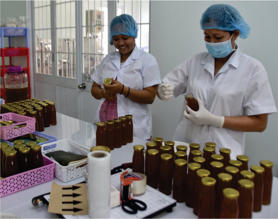 Bà Thạch Thị Chal Thi (bên trái) kiểm tra chai sản phẩm mật hoa dừa cô đặc.