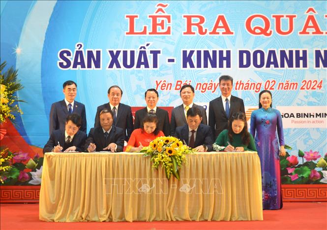 | Các doanh nghiệp trên địa bàn tỉnh Yên Bái ký kết chương trình phối hợp sản xuất kinh doanh (Ảnh: Nguồn TTXVN) |