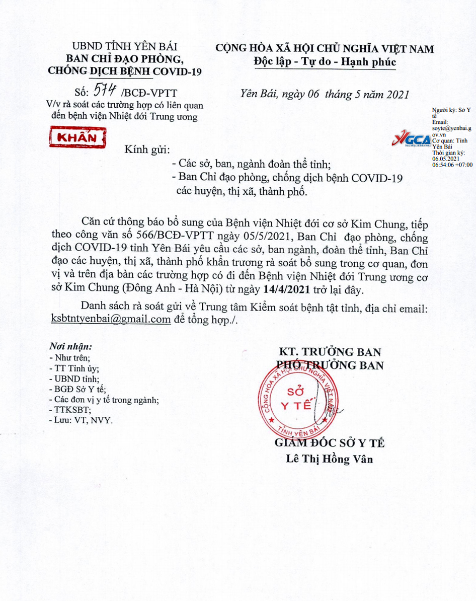 Theo đó, Ban Chỉ đạo phòng chống dịch bệnh COVID-19 tỉnh Yên Bái yêu cầu các sở, ban, ngành, đoàn thể tỉnh, Ban Chỉ đạo các huyện, thị xã, thành phố khẩn trương rà soát bổ sung trong cơ quan, đơn vị và trên địa bàn các trường hợp có đi đến Bệnh viện Nhiệt đới Trung ương cơ sở Kim Chung (Đông Anh, Hà Nội) từ ngày 14/4/2021 đến nay.