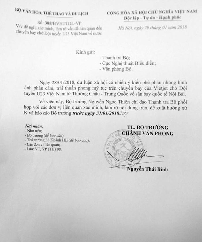 Sáng 29/01, Văn phòng Bộ VHTTDL đã phát ra văn bản số 388-BVHTTDL-VP đề nghị xác minh, làm rõ vấn đề liên quan đến chuyến bay chở Đội tuyển U23 Việt Nam về nước