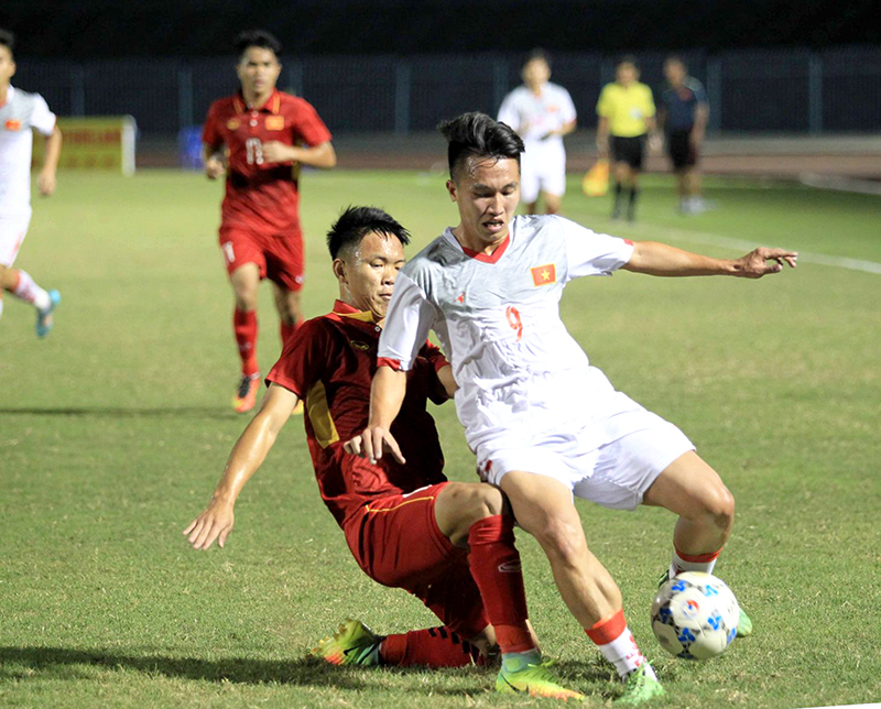 Cầu thủ U19 Việt Nam (trái) trong trận đấu với U21 Việt Nam tại giải U21 quốc tế.