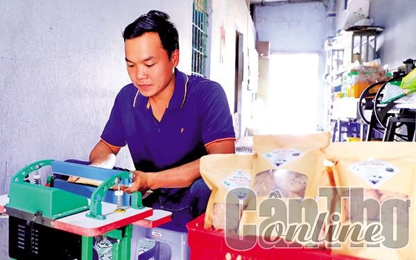 Anh Ðỗ Hoàng Giao, chủ cơ sở sản xuất bánh đa, hủ tiếu Nhật Nguyệt, đóng gói bao bì sản phẩm bánh đa đồng tiền.