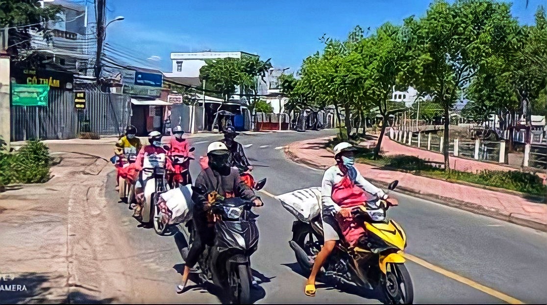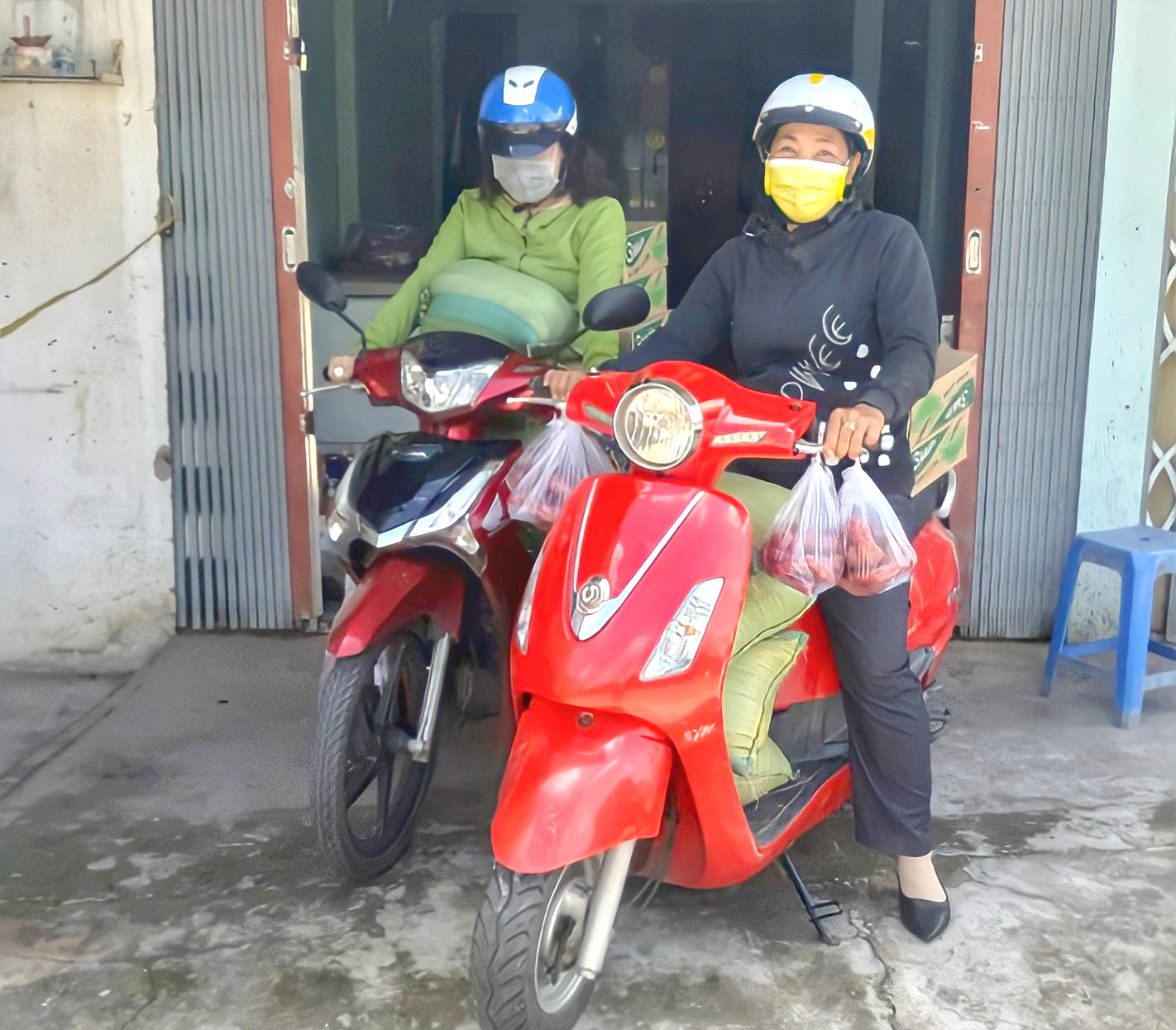Nhóm của chị Lê Thị Hồng Nga vận chuyển nhu yếu phẩm bằng xe máy, hỗ trợ người dân trước khi TP.Tân An thực hiện Chỉ thị 16 của Thủ tướng Chính phủ